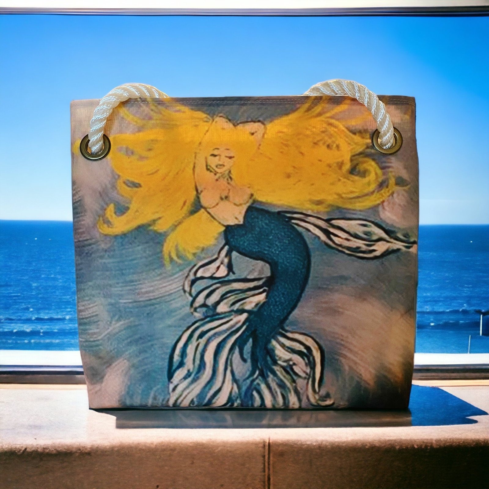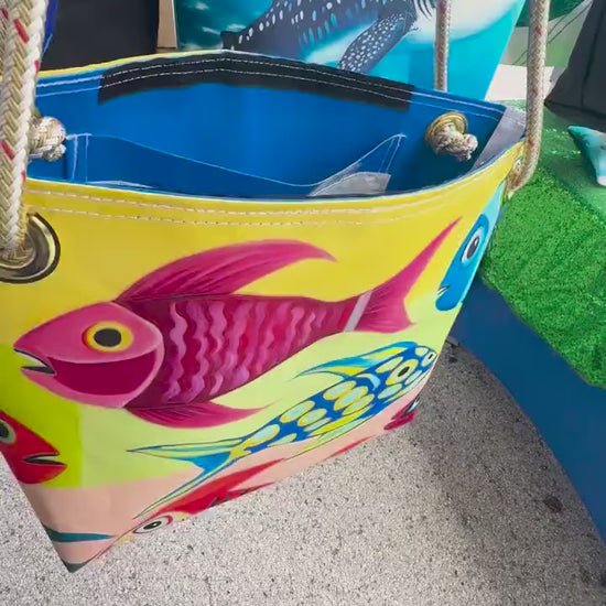 Fish Art Tote Bag – Handmade from recycled sailcloth with waterproof marine canvas liner. Eco-friendly, nautical tote featuring vibrant fish artwork inspired by the Florida Keys, perfect for ocean lovers and coastal style enthusiasts.